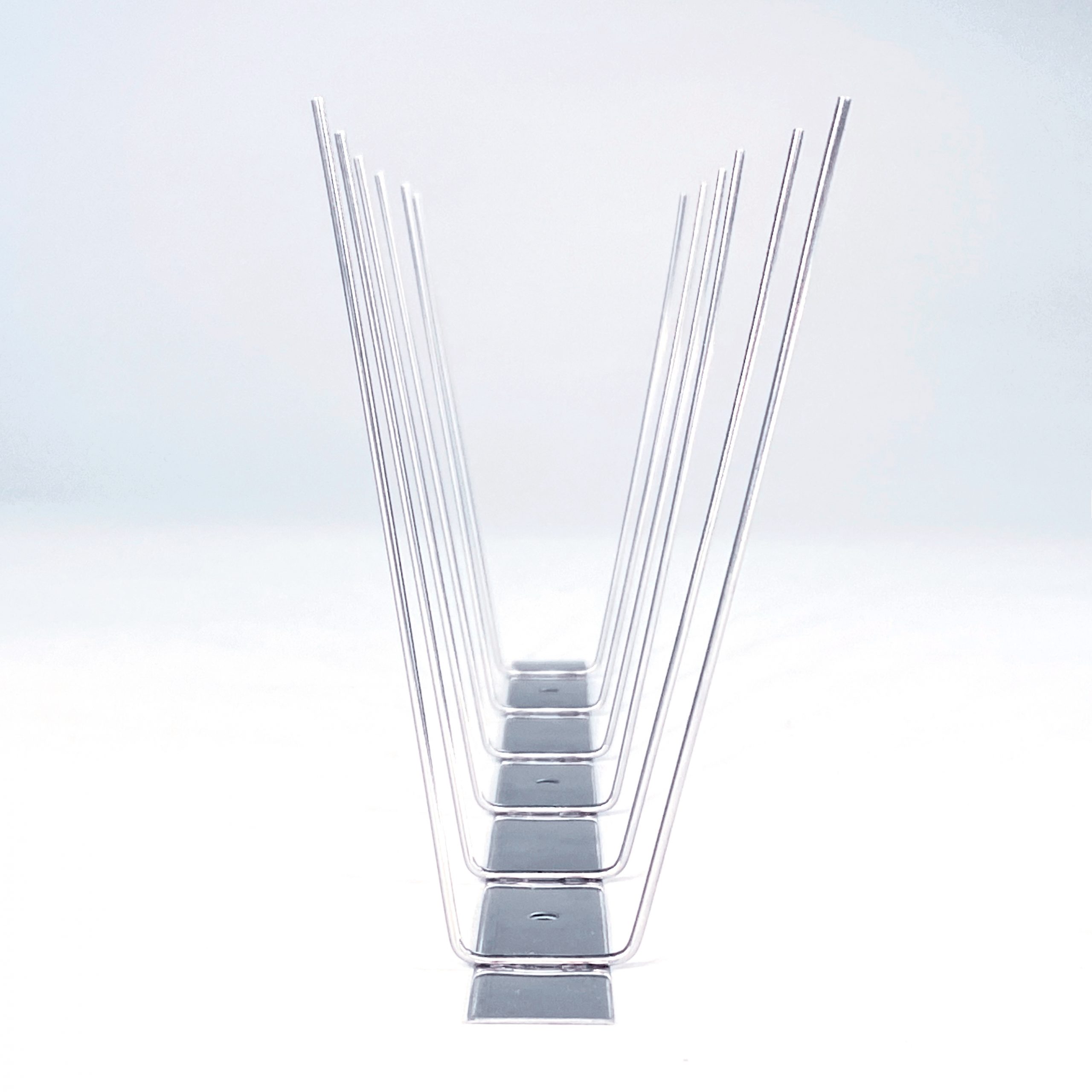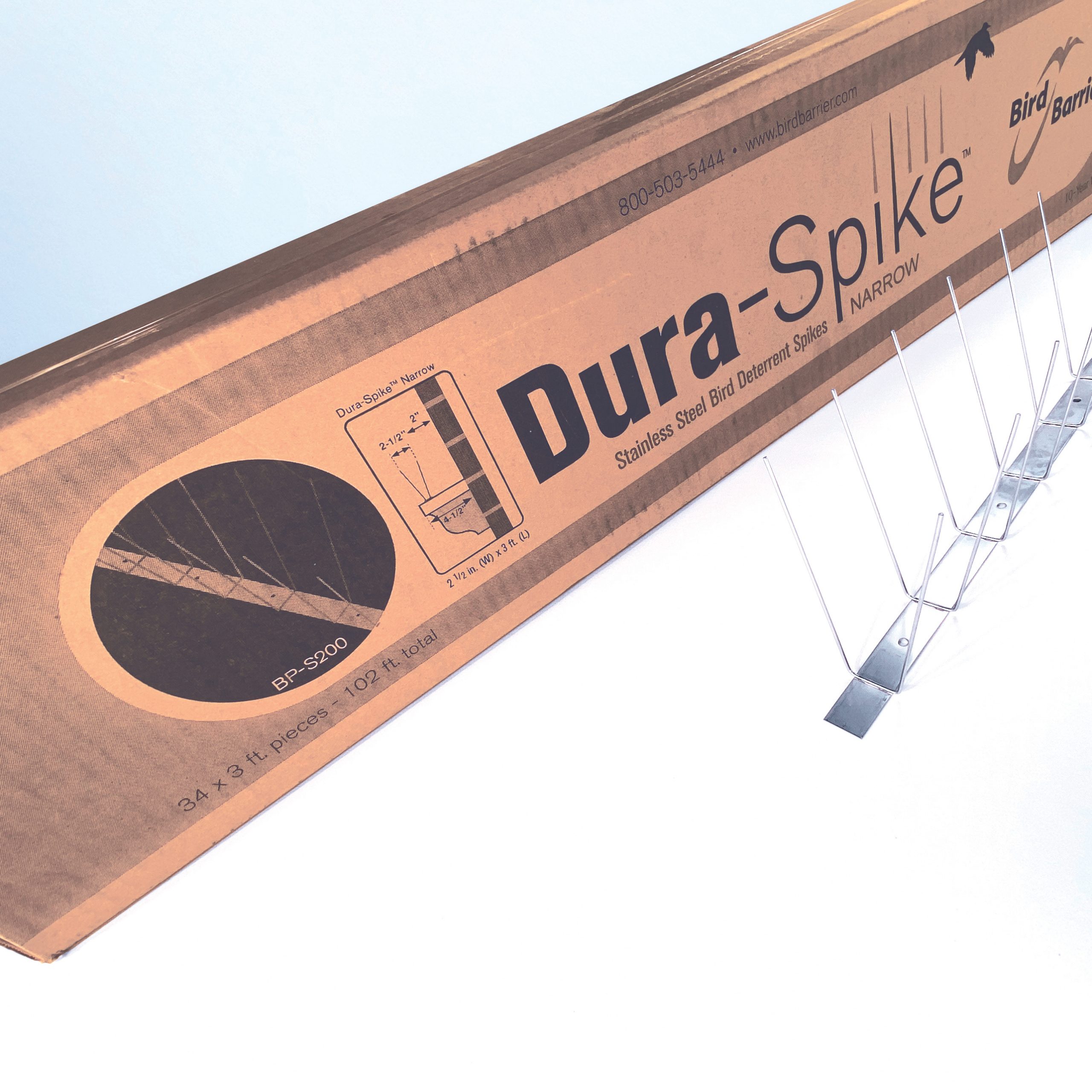 Dura-Spike Bird Spikes are 100% stainless steel and are available in three-foot lengths for fast application. The base can be cut easily with snips or shears. It curves gently or takes hard bends to conform to the building’s features. Widths: Narrow, Wide, Xtra-Wide, comes in 3-foot strips.